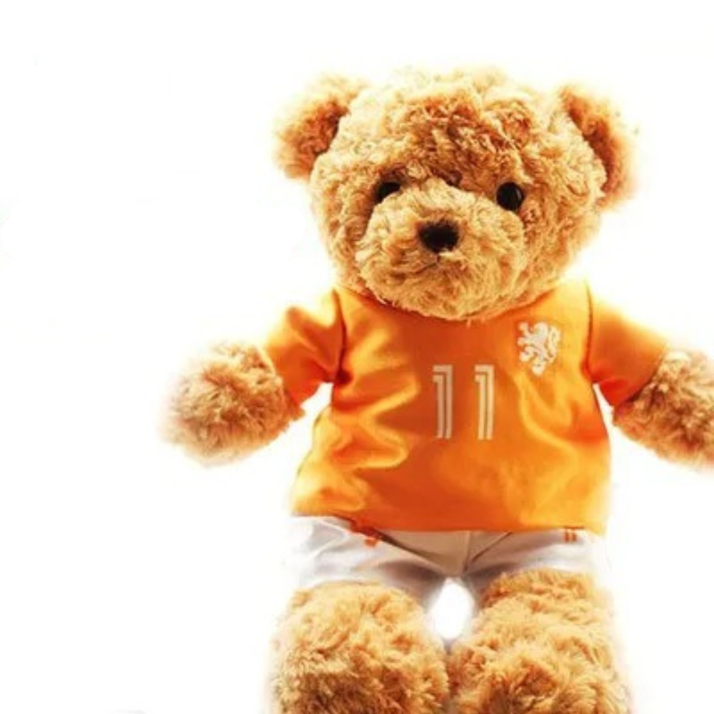 Den här underbara nallen bär Nederländernas klassiska orange matchtröja med #11 på bröstet – en symbol för fart, teknik och holländsk fotbollstradition.